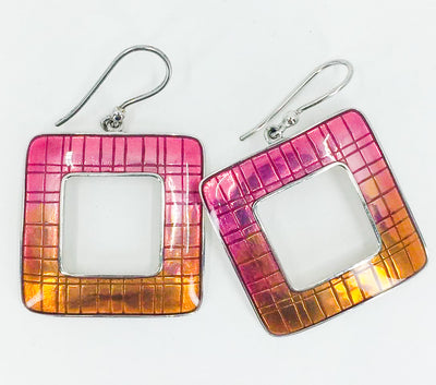 Pink and Orange Glassy Finish Pure Silver Square Danglers