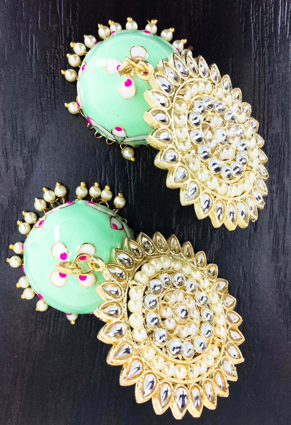 Teal Enameled Meenakari Polki Designer Jhumka with Pearls